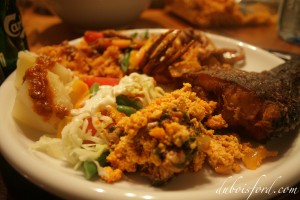 Osei, our driver, greeted us at the Accra International Airport and we swiftly moved to the car only to sit in travel. The travel was terrible to say it politely. It took us about 30 minutes to cover the ½ mile road from the airport to the main road. Once we got to our lodging there was a nice cook named Angela there to greet us. She had prepared a delicious meal of Egusi, Fish, Red-Red, soft-shell crabs and rice. We spent the balance of the evening conversing over Ghanaian “Star” beers. As good as the food was from earlier, I was glad I had brought my traveler’s diarrhea pills to help me sleep.