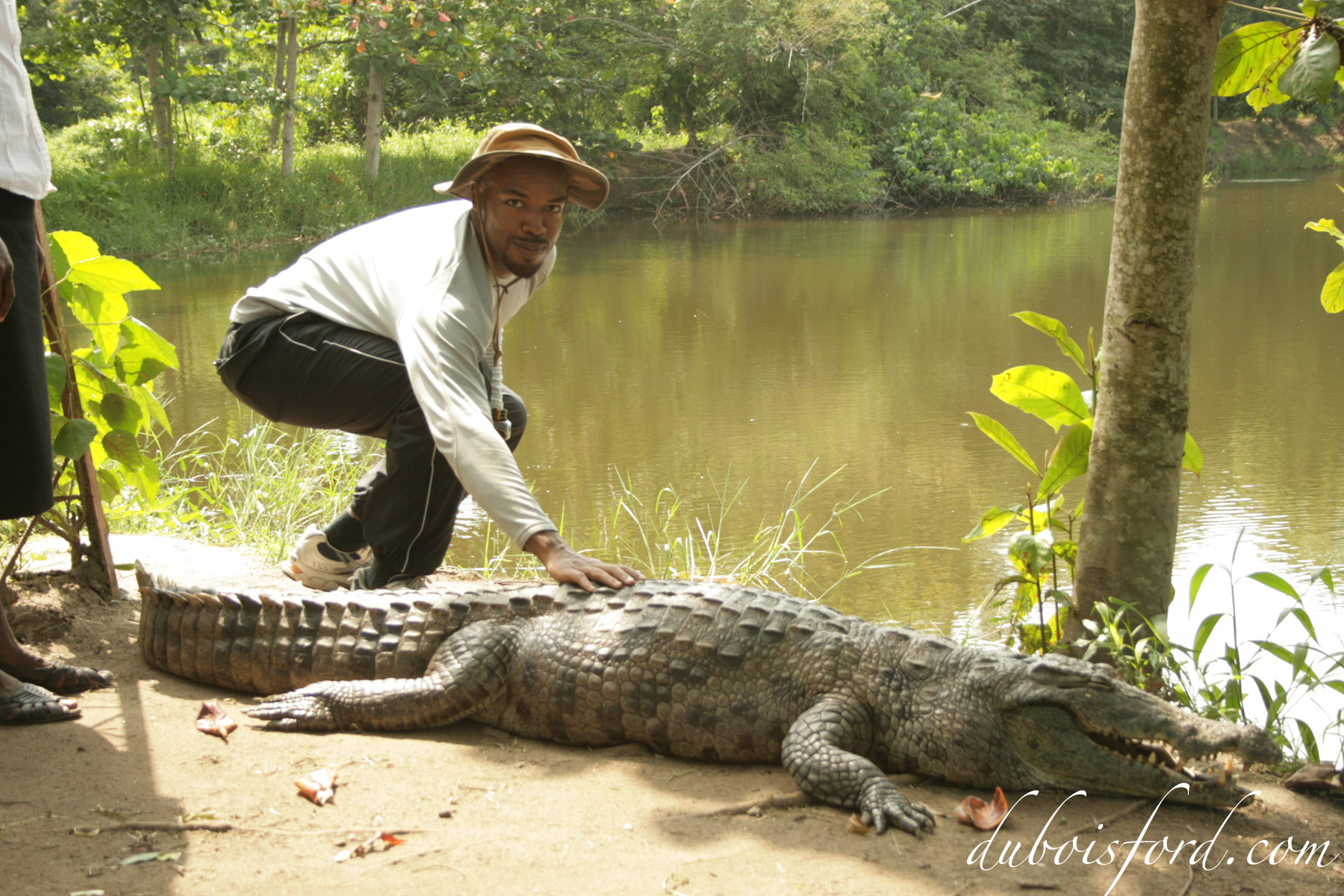 Unfortunately, the name escapes me at the moment. However, on the drive back from Kakum Rainforest to Accra we visited a small lake with a few crocodiles as local residents. I touched a crocodile. My heart stopped beating for a while but it eventually started back